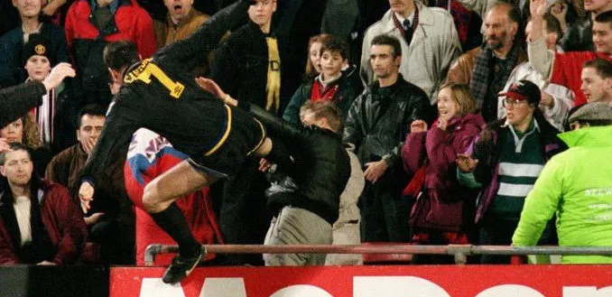 Au fil du match, la tension monte. Cantona finit expulsé. Et là, au moment où il traverse le terrain pour sortir, un supporter l’interpelle violemment depuis le bas de la tribune. Ce qui suit, l’Angleterre ne l’a jamais vraiment “rangé” dans une case : Cantona franchit la barrière publicitaire et assène un coup de pied sauté resté dans l’histoire sous le nom de “Kung-Fu kick”.